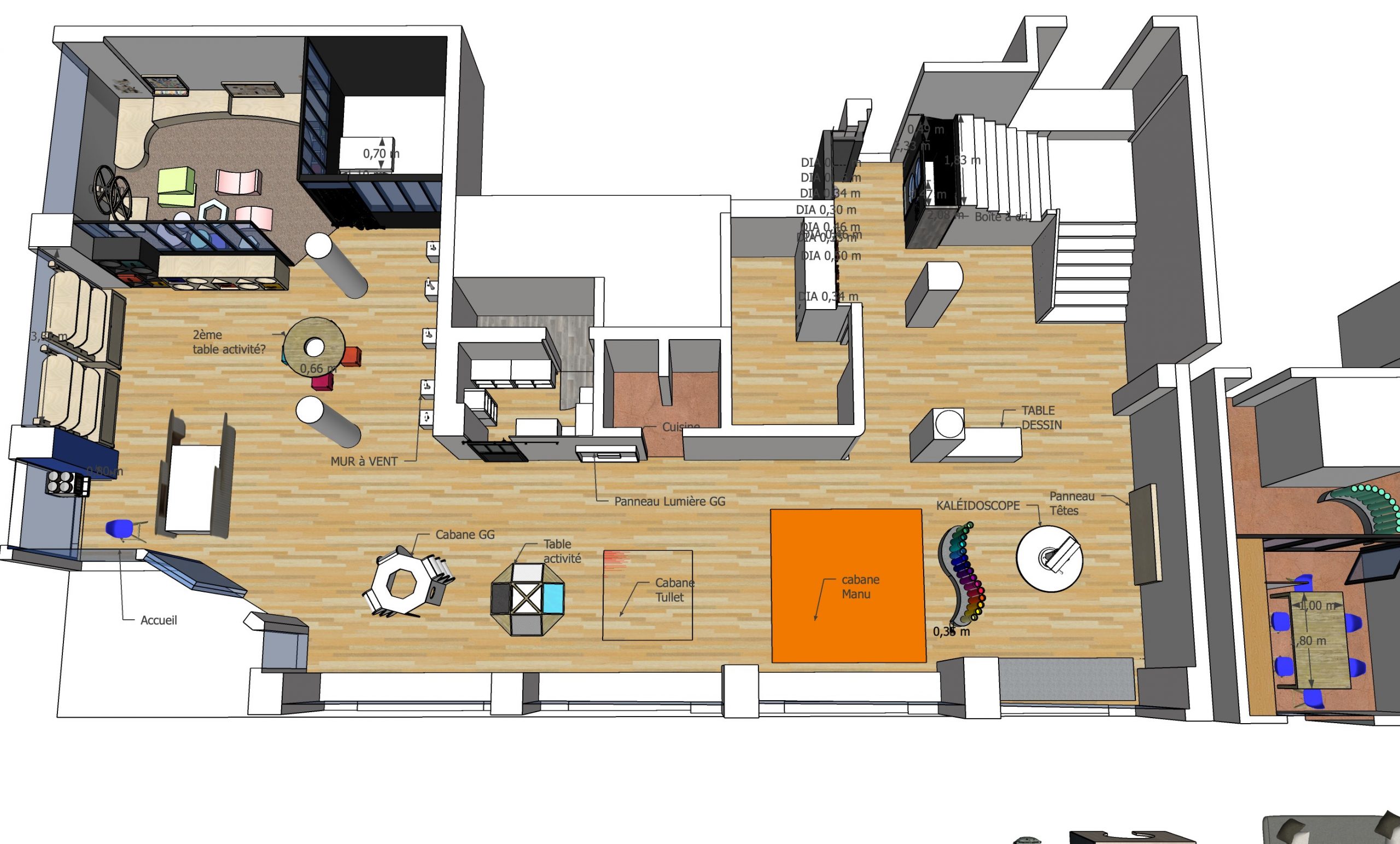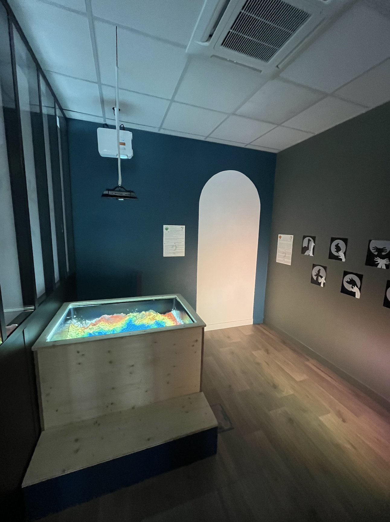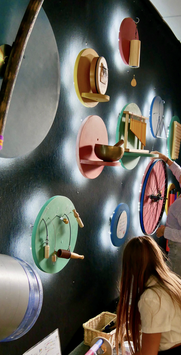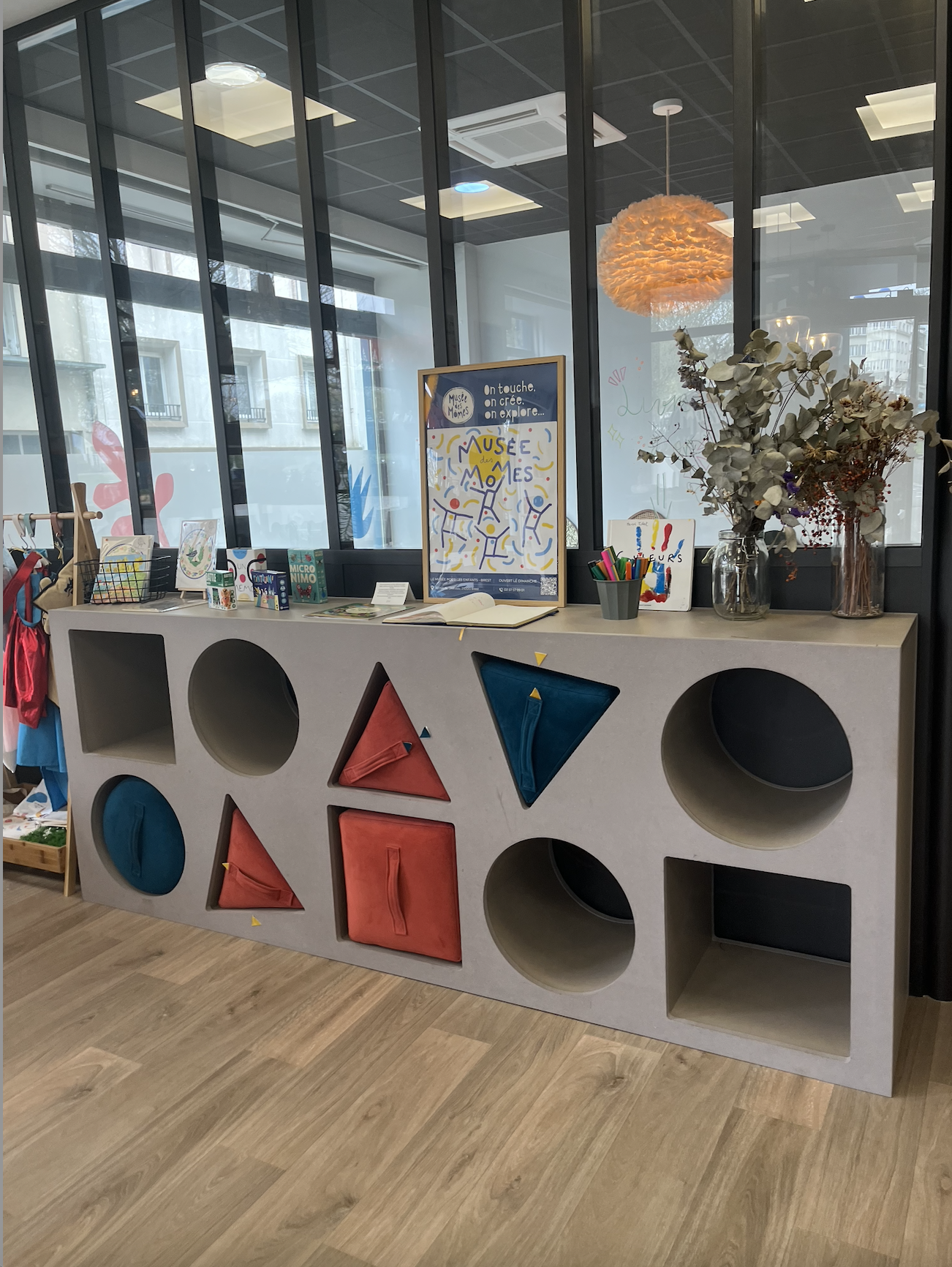 Conception de la scénographie du lieu. Réalisation d’un mur du son (conception et fabrication). Conception de mobiliers ludiques et de rangement. Coordination avec les entreprises. Projet de vitrine. Réalisation d’une roue des couleurs. Conception d’un panneau « têtes » aimantées.